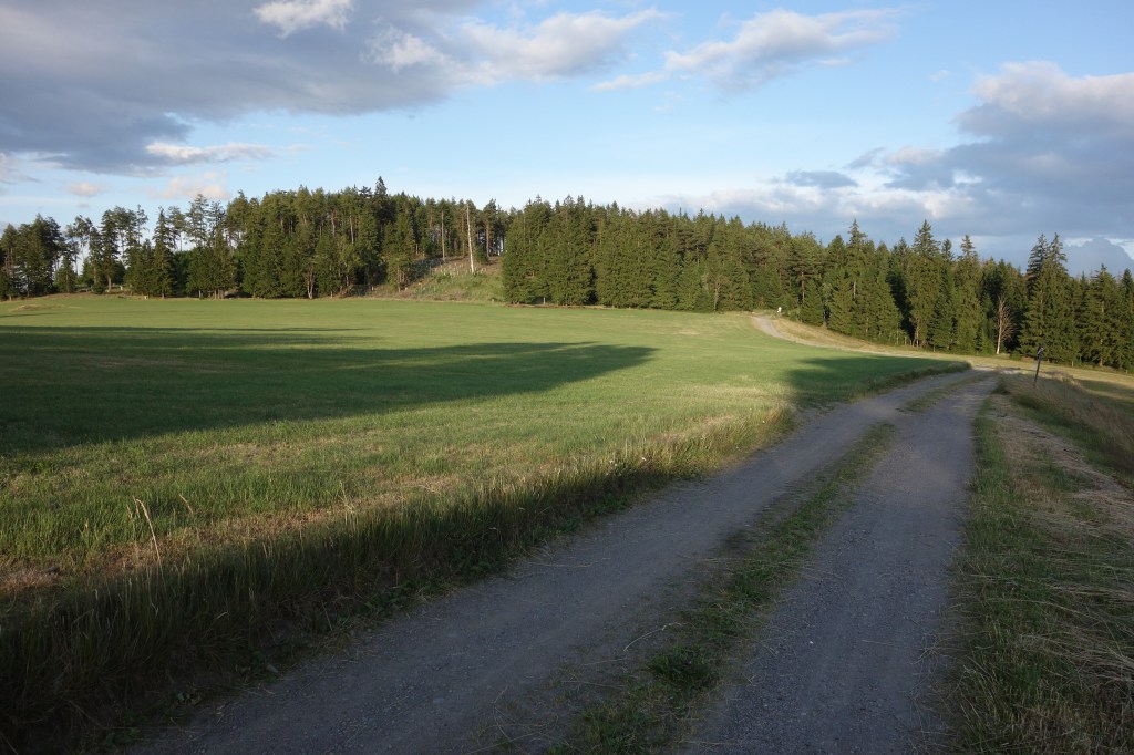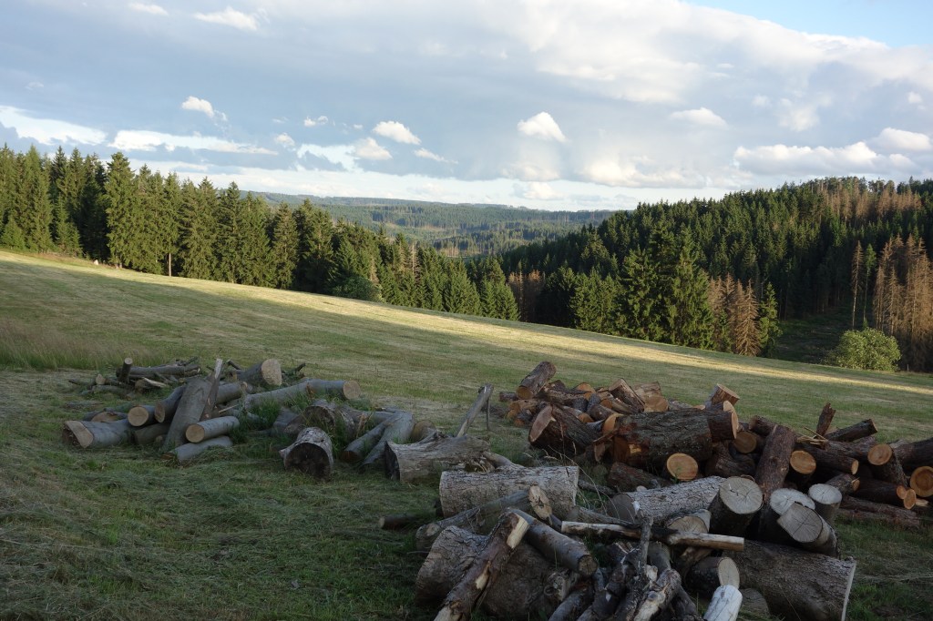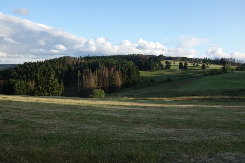 Dieses südöstliche Fenster in die Ferne ist das einzige, das sich öffnet; ansonsten ist das Haus ganz von der nahen Umgebung eingehegt. Aber da wir uns hier fast ganz oben befinden, ist die Einhegung eine sanfte, das Haus nur um wenige Meter überragende, von freier Höhe durchlichtete. Im Winter geht die Sonne hinter der Schanze auf, wodurch sich der späte Sonnenaufgang weiter verzögert (ein herrliches Zögern). Schanze ist der Name des Hügels, der in ostsüdöstlicher Richtung den linken Rahmen des Fernblicks bildet. Im Dreißigjährigen Krieg war dort eine Schwedenschanze errichtet. Jetzt im Sommer freilich steht die Sonne schon am Morgen hoch darüber. Der höchste Punkt der Schanze liegt auf 760 Metern ü. NN.; vom Haus aus gesehen handelt es sich also nur um eine bewaldete Düne, zu der von der Straße aus, an der das Haus steht, ein breiter Feldweg führt, der in einen Waldweg übergeht. Der Schanze vorgelagert ist der obere Teil des genannten Wiesengeländes, die Höhe der Schanze flacher fortsetzend und eine frei begehbare, schön geschwungene Kuppe oder Wölbung formend, bei der es sich, nur wenige Schritte vom Haus entfernt, bereits um die erste Wasserscheide handelt. Die Wasser des Geländes hinter der Wölbung sammeln sich im Deesbach, dem Dorf den Namen gebend. Er fließt steil hinab und mündet in die Deesbacher Talsperre, welche die den Horbach und den Fischbach aufnehmende Lichte staut. Die Schanze, die vom Haus aus gesehen als Düne erscheint, ist auf der Rückseite also ein gewaltiger Berg, der einen tief eingeschnittenen Talgrund überragt.