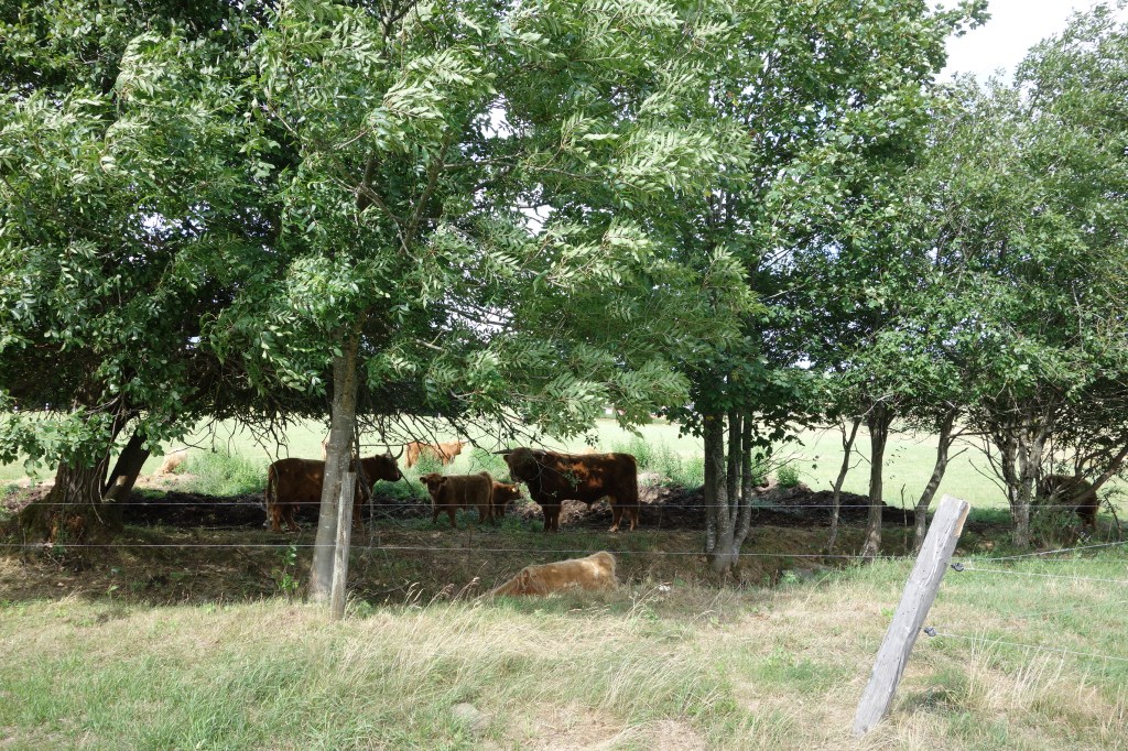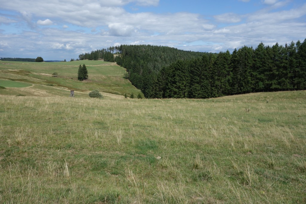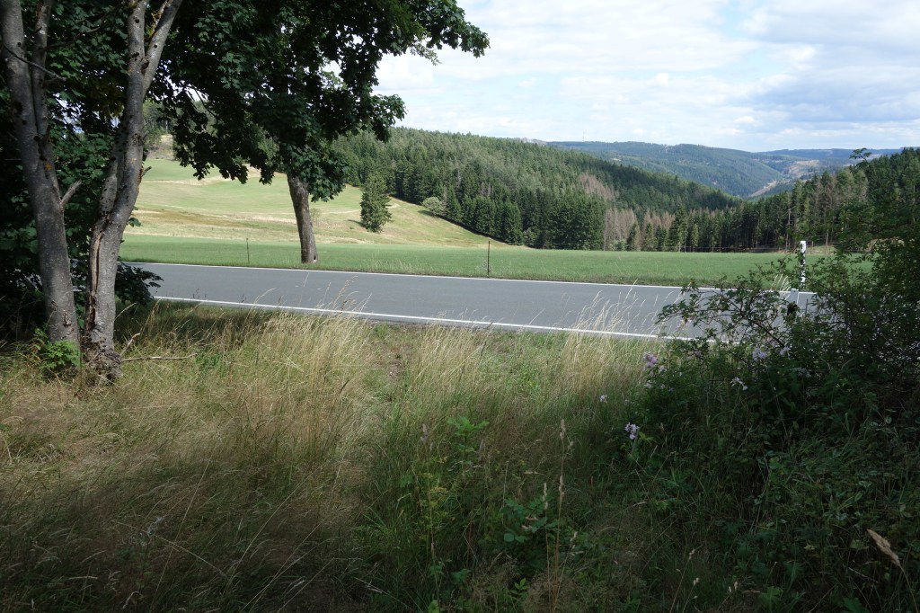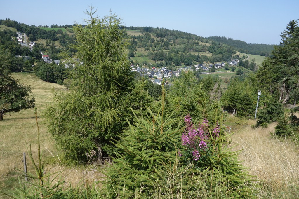 Julilang einmal täglich zur Quelle – oder zutreffender: zur Sammelgrube – des Horbachs nahe der Hauptstraße gehen, von wo sich herrliche Eschen und Erlen, die den Rindern Schatten spenden, den Bachgraben entlang hangabwärts ziehen. Von hier aus sieht die Schanze ganz vorzeitlich aus, erscheint als reine Vorzeitform. Hier stehen und stillhalten, dir genügt’s. Und einmal täglich auch auf die gegenüberliegende Seite gehen, dort sitzen, aufs Dorf blicken und stillhaltend den Juli-Mut der Weidenröschen fassen.