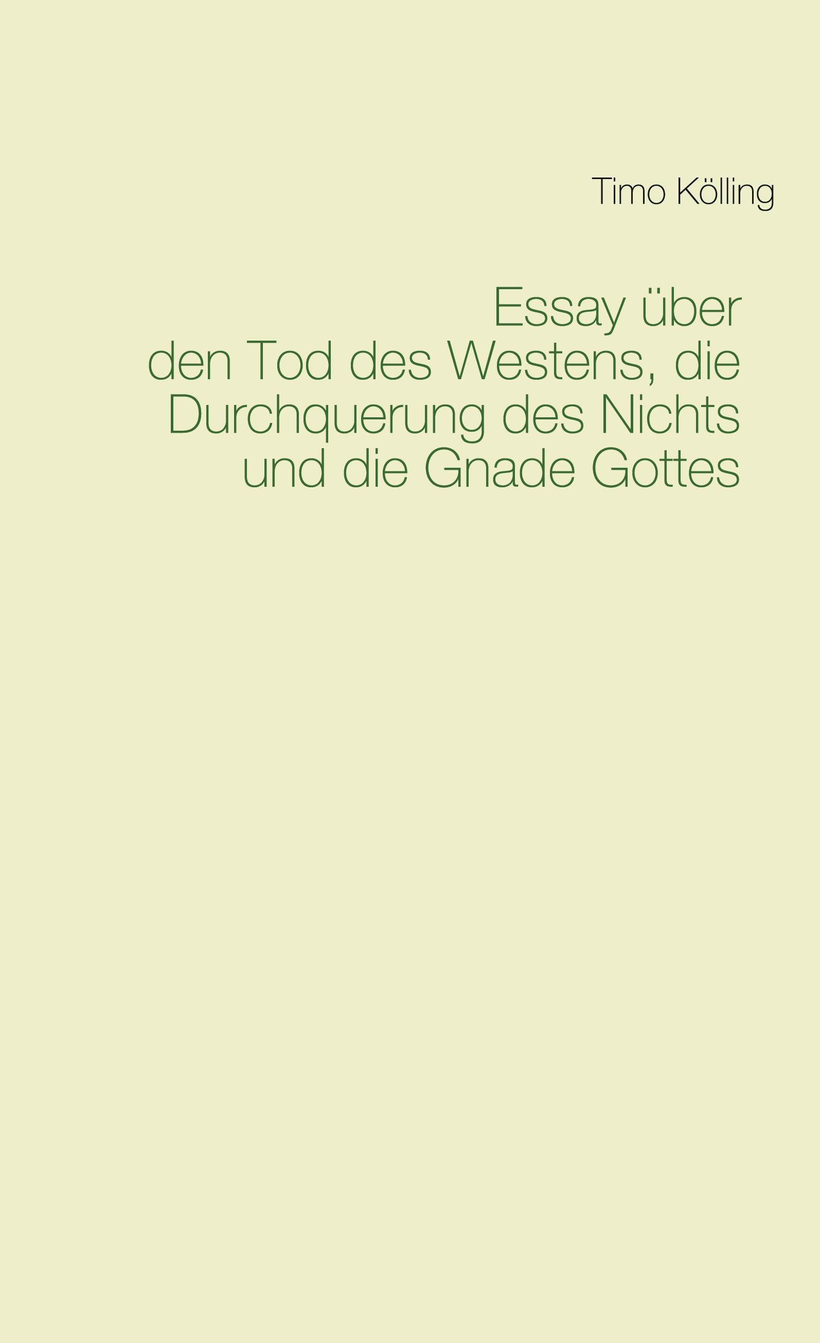 Der Westen und die Postmoderne sind an ihr Ende gelangt. Die Wiederkehr der Tradition setzt ein Denken voraus, das sich dem herkömmlichen Begriff von Kultur entzieht. Das sind die beiden Hauptthesen von Köllings »Essay über den Tod des Westens, die Durchquerung des Nichts und die Gnade Gottes«. Der Titel ist eine Anspielung auf den 1851 erschienenen »Essay über den Katholizismus, den Liberalismus und den Sozialismus« von Juan Donoso Cortés. Dessen Position wird, in enger Berührung mit den Werken Leopold Zieglers und Martin Heideggers, für eine geschichtsphilosophische, politisch-theologische Gegenwartsbestimmung fruchtbar gemacht.